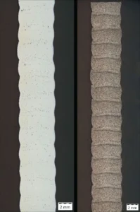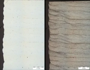 For each material, we produced both thin (5mm) and thick (50mm) WAAM-printed test pieces using MX3D’s robotic WAAM systems. These samples were then subjected to: